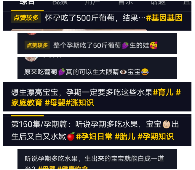 不知道孕妈们会不会看某音、某手,“孕期吃了500斤葡萄,生了一个大眼萌宝”这样类似话题的小视频在这些app上层出不穷,其实为的就是博人眼球,吸引流量。