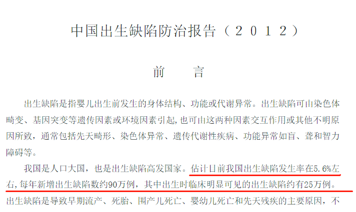 根据2012年9月原卫生部发布的《中国出生缺陷防治报告(2012)》统计,目前我国出生缺陷发生率在5.6%左右,每年新增出生缺陷数约90万例,据估计,2020年,中国出生缺陷或达113万!